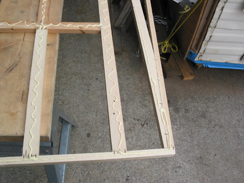 Largest cabinet with fridge opening: Front view finished. Ready for the gimp molding to be put on. See it at the bottom left in a coil?