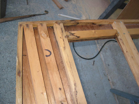 Bathroom storage cabinets partition: New pieces fabricated and glued and stapled in place. The old pieces are sitting on top for comparison. Bathroom storage cabinets partition: Top corner rebuilt.