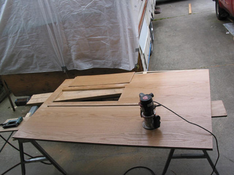 Bathroom storage cabinets partition: Close up of the glue. Bathroom storage cabinets partition: New paneling partly done and in the middle of routing out the openings.