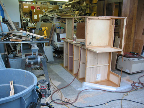 Largest cabinet with fridge opening: Mostly finished with new facing, shelves and paneling. Yes, that is an Oldsmobile under all those trailer parts!