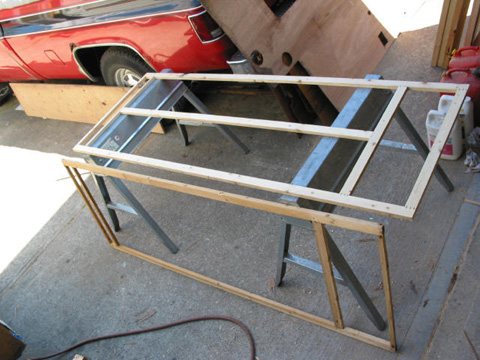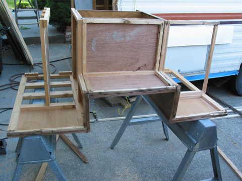 Main wall partition: This one separates the bathroom from the rest of the trailer. This one was tough to rebuild. The old one was so rough, it had fallen apart in several places. Bench seat and bed bottom: This is actually the first one I did. It was easy because nothing else has to line up with it. Pardon the piles of stuff - gotta store it somewhere!