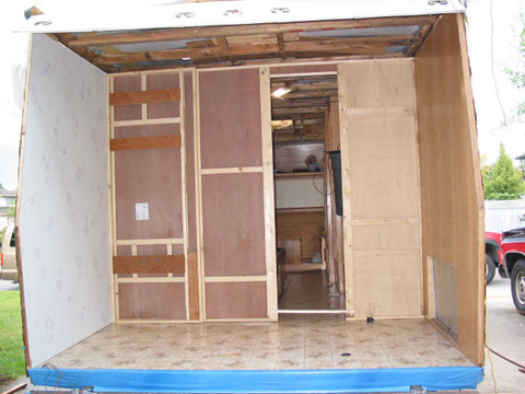 Main bathroom partition: As viewed from the kitchen. The main bed goes against this to the right where the water tank is sitting now. View towards front: Main kitchen cabinet there. The old wood you see is only sitting there for now until I rebuild them too. I needed room in the garage.