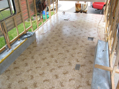 Floor prepped: All the seams & screws are filled and sanded. Now ready for new linoleum.