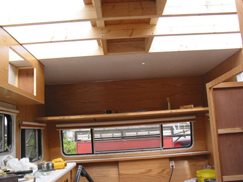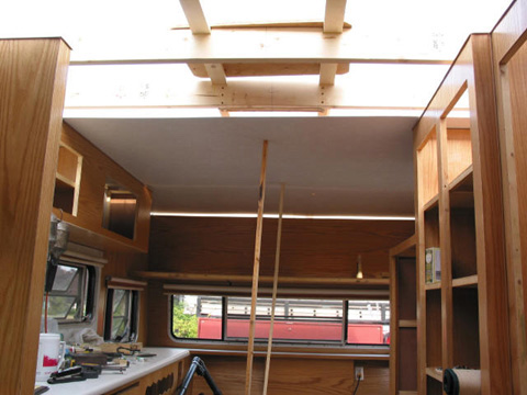 Design flaw correction: Same correction as the front. I was only able to do one rafter here due to the vent location. First ceiling panel: Its been a long time coming but the first ceiling panel is finally in. First ceiling panel: Same thing as viewed a little further back. RV rubber roof can essentially be leak-proof for about 30 years. Installing second panel: Here's how I get them in - lift the roof up onto blocks and slide the panel in between the wall and the roof. Cutouts for wires etc. were calculated and done first. Gluing the panels up: I used PL Premium panel adhesive to hold the panels in place. From the inside I used decorative brass colored nails in a grid pattern. The joints are stapled as they will be covered.
