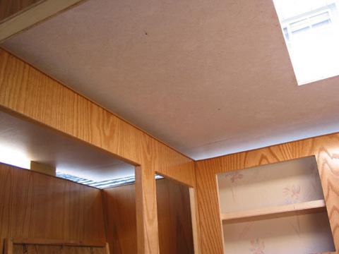 Holding the panel up: I used a couple pieces of 1X2 as temporary props while I positioned and fastened the panel. Bathroom ceiling: You can see the gap while the roof is still up on blocks on top of the walls. Bedroom ceiling: This is above the main bed area. All work, text, and photographs courtesy of Bob Hanover |