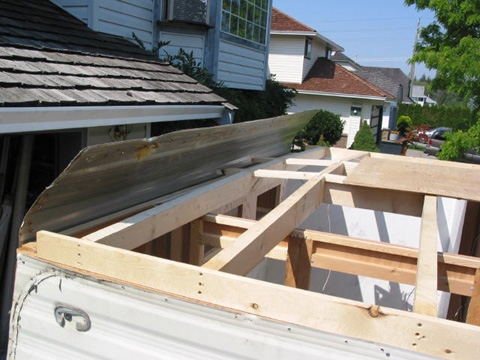 Design flaw correction: I had to gradually slope the roof down to both ends in order to allow the new one piece aluminum roof to curve over the ends without puckering. I Initially had the rafters all the same.
