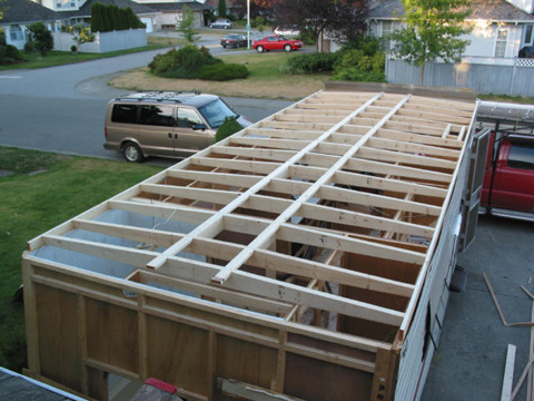 Roof framing: Another shot - Note the slope from the 1X3 runners down to the edge.
