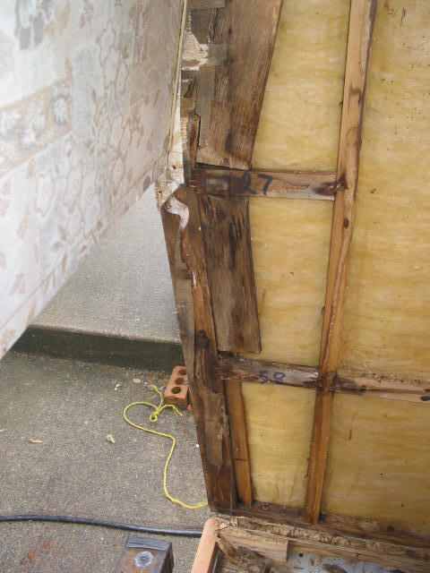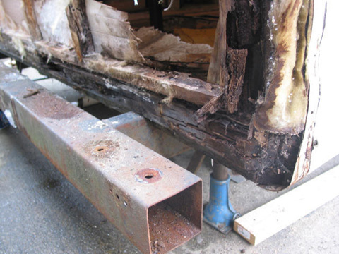 Replacement starts: The back and one side up to the wheel well outside framework - replaced with clear fir for strength.