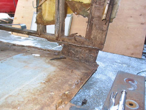 Back corner: After stripping the corner out, the major structural damage is evident everywhere. Note the blackened wood compressing from the rot.