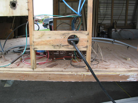 Fresh water cutout from outside: Well, I guess I'm replacing all this too. Shore power opening: Through all this, I'm still hooked up and using my shore power inside. It will have to be removed to fix this area.
