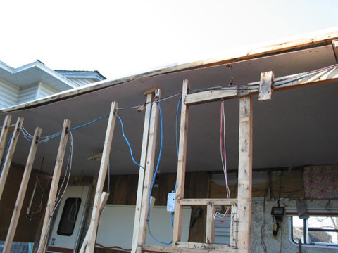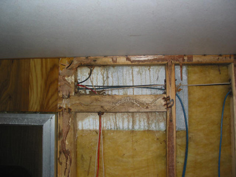 Front corner - kitchen side: This window leaked the worst, as evident in the paneling. Sure wish I could find some panels to match. Above kitchen: The top panels are rotted out. Studs seem OK.