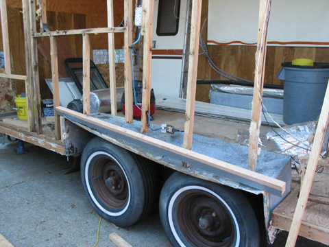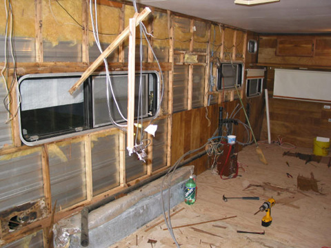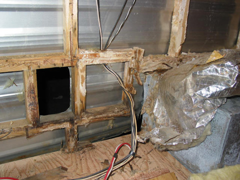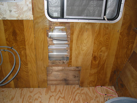| This page I wrote for my old rv website RVforSaleGuide.com before developing the Vanabode as the best travel vehicle for cheap easy long term road trips. People still like big rv's despite the much greater cost and trouble to operate, so here's what I know about them. Travel Trailer Water Damage page 6RV trailer repair floor water damage, roof leaks, wall damage Wall beside door: This one didn't look too healthy from the outside. Doesn't look very promising from the inside, either.
