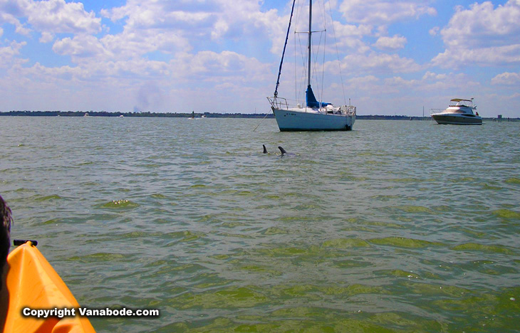 Above: Picture of dolphin dorsal fins peaking out of the water while kayaking on the Banana River.