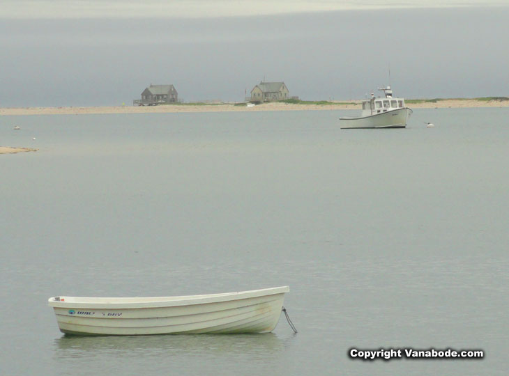 We park at the Chatham Fish Market and Municipal Pier for free access to the water, beaches and bathrooms. Fishing boats come in one by one and the fishermen unload their catch, then pull away, and anchor out a few hundred yards. Within minutes the crews row their dinghies ashore, walk up the piers, pass through the bait shop and climb up into oversized pickup trucks to join girlfriends and wives waiting in the parking lot.