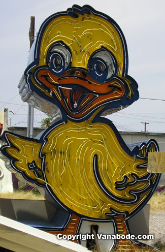 I don't know what we were thinking. That maybe the mid-summer heat wouldn't affect us because we were born and raised in Florida with hot and humid weather and we could handle any sort of heat. You constantly hear that Las Vegas' dry heat is easier to handle. Well, that is so untrue. Heat is heat and hot is hot. It's all miserable in the end. Anyway, every inch of my shirt and shorts and arms and legs were drenched with sweat. So my advice to you is to not go during the summer unless you don't mind being terribly miserable for hours standing in flip flops on hot dry dirt without a bench or stitch of shade in sight. But the historical signs were really cool; look how happy little ducky is.