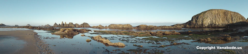 Above: Rocks glued with kelp is exposed during low tide. The sea life you will view in the tidepools are soft and spongy, hard and slimy and all sorts of weird shapes. Starfish can lose an arm and grow another one. All of the marine life along the coast that you see and don't see are extremely fragile. It is best to look and take pictures of these fascinating creatures but not to touch or remove from their environment, as it will quickly die and stink and won't be around for the next family to see. Click Oregon Coast Trip camping details for more information and pictures.