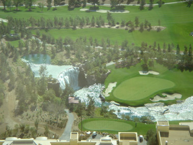 Photo taken from the Wynn Towers of hole 18 of the Wynn Golf Course with its giant waterfall, rivers and lake. The course is over 1 mile wide. It feels like one is golfing in Colorado, not on the Strip in Las Vegas. To golf at Wynn, you must be staying at the Wynn Hotel and Casino, or be the guest of a hotel guest. Wynn rarely waves this requirement; you can try during the middle of the week, maybe you'll get lucky and get on the course. Fees are expensive unless you have been comped. To get comped you must be a VIP, or gamble a lot. Golfers who don't want to pay these prices will have to golf off-Strip. Try highly-rated Paiute Golf Course; it's about 35 minutes from the Strip. Wynn Golf Course is 18 holes and covers 138 acres. There are 11 holes with water. It's over 7,000 yards from the tips. To create dramatic elevation changes, over 800,000 cubic yards of dirt was moved around. Wynn course is a par-70 with slope rating of 124. The greens are planted with Penn Links Bentgrass made to USGA specifications. Tifway II Hybrid Bermuda grass covers the fairways. 6,000 trees were brought in from North Carolina to make this course fully tree lined and private. The Wynn Golf Course was completed in 2005. There are actually 2 golf courses on the Strip. The other is Bali Hai Golf Club. It sits at the other end of the Strip, and is a paradise with a whopping 7 acres of water and over 10,000 tropical plants. There is one more course just off the Strip near Bali Hai; it's called Callaway Golf Center. It is a 9-hole course that is good for practice and convenient. It also has a golf school, Giant Academy, for affordable golf lessons of every kind, from video to pro.